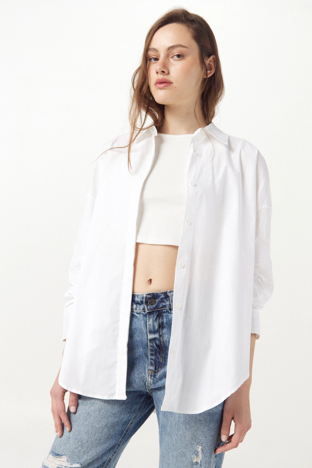 Para un look más a la moda, la camisa blanca se combina con colores de temporada como caramelo y arena, ya sea en pantalones de jean, gabardina, lino o incluso en versiones de simil cuero, logrando outfits modernos, frescos y muy actuales.